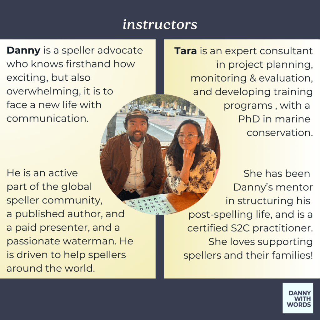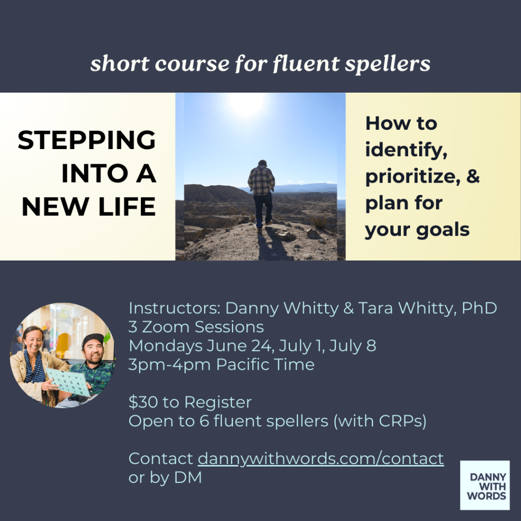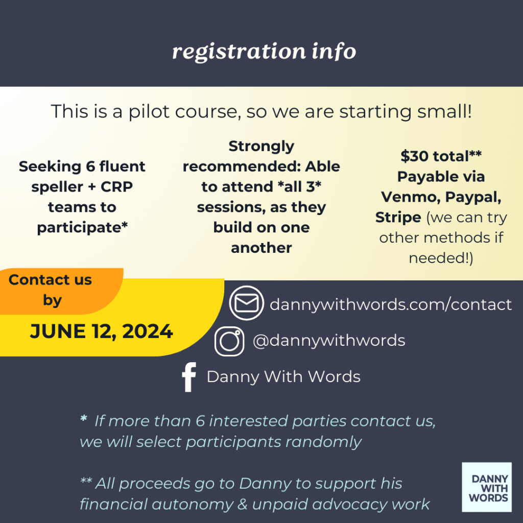 – Open to fluent spellers with their CRPs (Communication Regulation Partner). Please contact me at DannyWithWords.com/contact or send me a DM here to learn more and/or register!