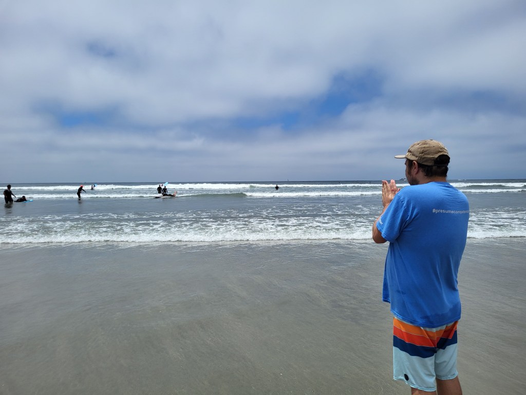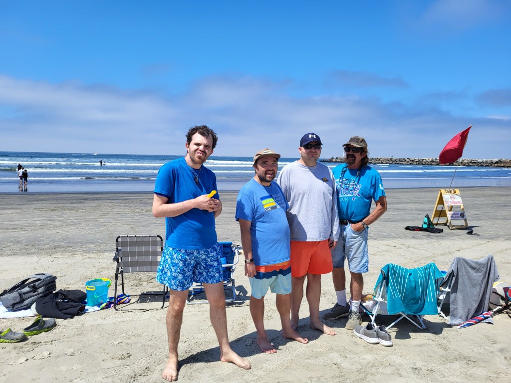 Second: I got to see friends again at Waves4All on Sunday. It was so much fun to surf with other spellers! I got to watch and cheer on friends, and even stood up a bit myself thanks to my surf mentors. I loved enjoying the ocean with friends!