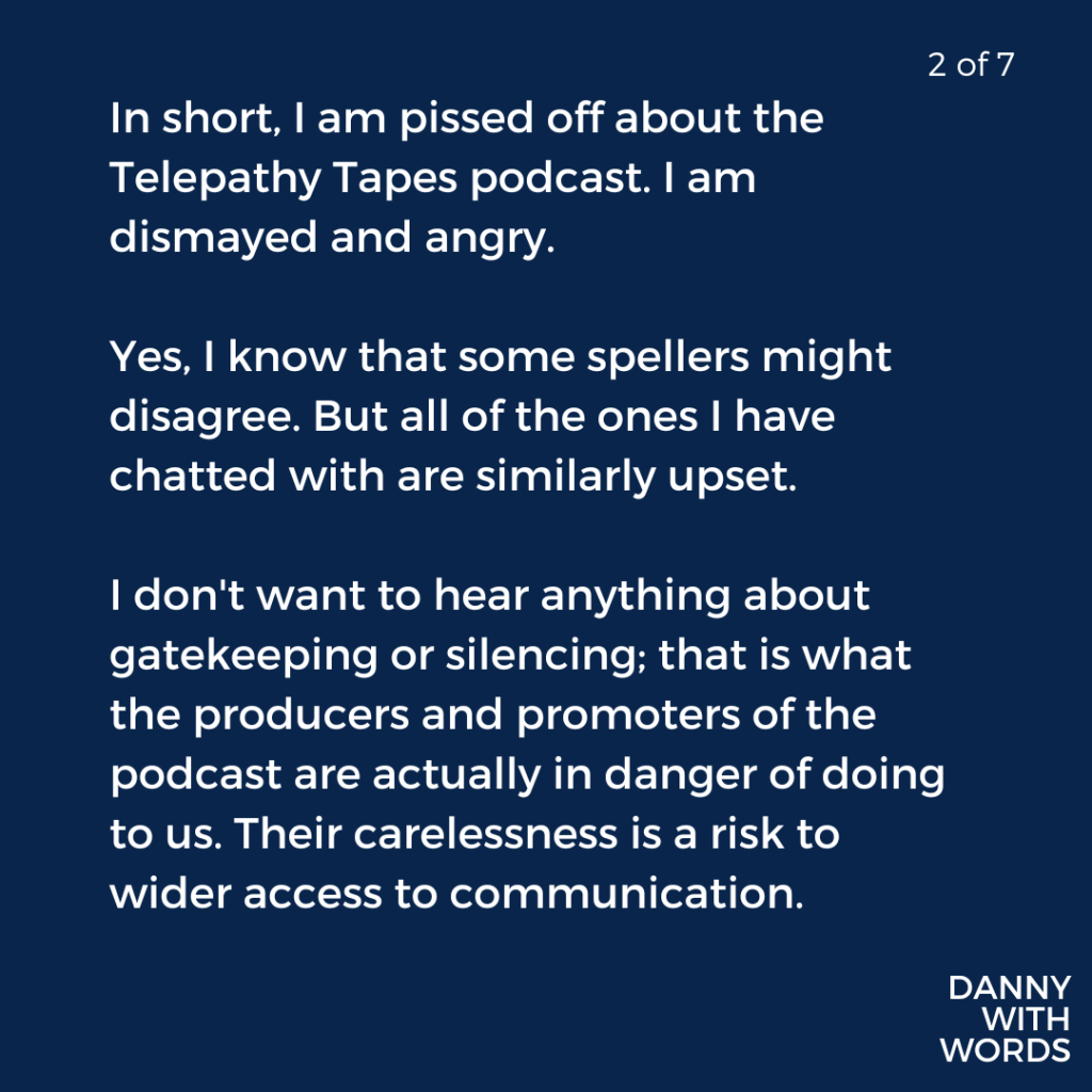 In short, I am pissed off about the Telepathy Tapes podcast. I am dismayed and angry. Yes, I know that some spellers might disagree. But all of the ones I have chatted with are similarly upset. I don’t want to hear anything about gatekeeping or silencing; that is what the producers and promoters of the podcast are actually in danger of doing to us. Their carelessness is a risk to wider access to communication.