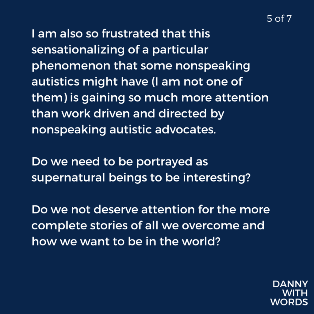 I am also so frustrated that this sensationalizing of a particular phenomenon that some nonspeaking autistics might have (I am not one of them) is gaining so much more attention than work driven and directed by nonspeaking autistic advocates. Do we need to be portrayed as supernatural beings to be interesting? Do we not deserve attention for the more complete stories of all we overcome and how we want to be in the world?