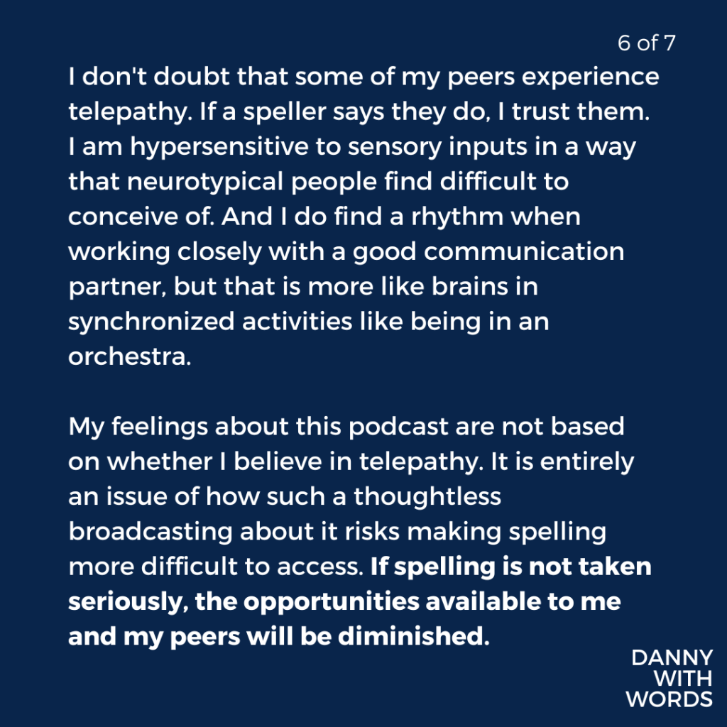I don’t doubt that some of my peers experience telepathy. If a speller says they do, I trust them. I am hypersensitive to sensory inputs in a way that neurotypical people find difficult to conceive of. And I do find a rhythm when working closely with a good communication partner, but that is more like brains in synchronized activities like being in an orchestra. My feelings about this podcast are not based on whether I believe in telepathy. It is entirely an issue of how such a thoughtless broadcasting about it risks making spelling more difficult to access. If spelling is not taken seriously, the opportunities available to me and my peers will be diminished.