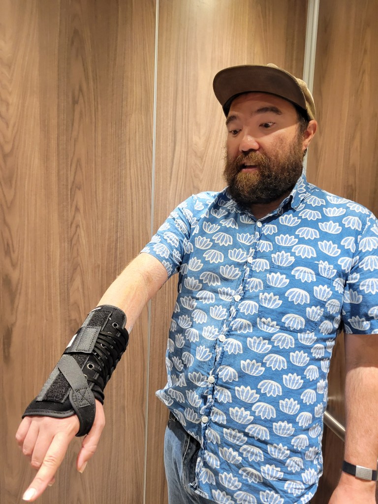 I also am elated that my arm is healing well, and I could replace the huge unwieldy splint with a forearm brace. Still it will be weeks before I can get in the water, and I can’t do regular weight-bearing on that arm for a while, but I can take the brace off periodically and I can wear my stylish jackets once again.