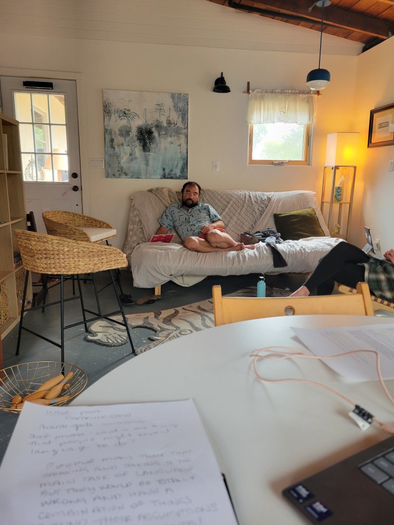 Then we had to make a long trek up to North San Diego County, with an accident on the highway ahead of us slowing us down as we ate delicious banh mi that we picked up on the way. We were a bit late to the afternoon activity, a study group for older spellers that Tara and another S2C practitioner are coordinating. It is so fantastic to have this opportunity to learn intellectually stimulating material with some of my best friends. This is our response to the lack of formal programs for advanced learning and socializing in person for us spellers here. I am proud of Tara for doing so much to help create a part-time option.