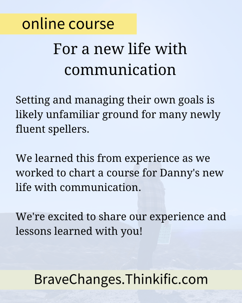 He asked me to share that update, and to share that our course – Goal Setting for a New Life: Setting & Managing Goals for Spellers – is now listed at full price, $55, as of today. We appreciate that so many of you joined the course during our first month’s discount! We hope that the word continues to spread and that even more spellers & support teams will be able to learn from it.