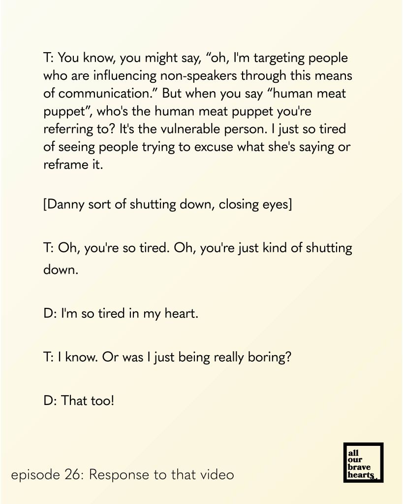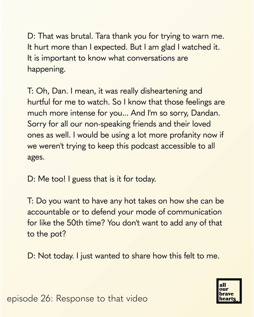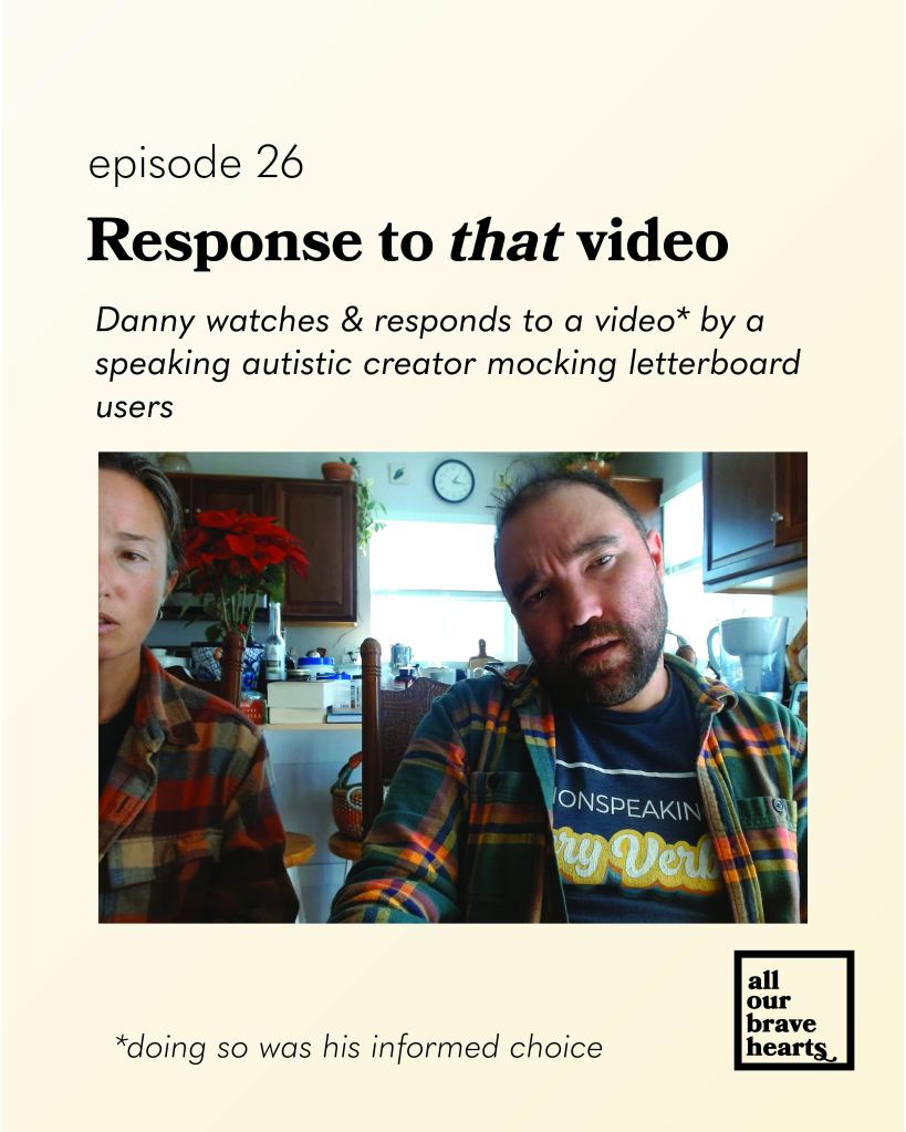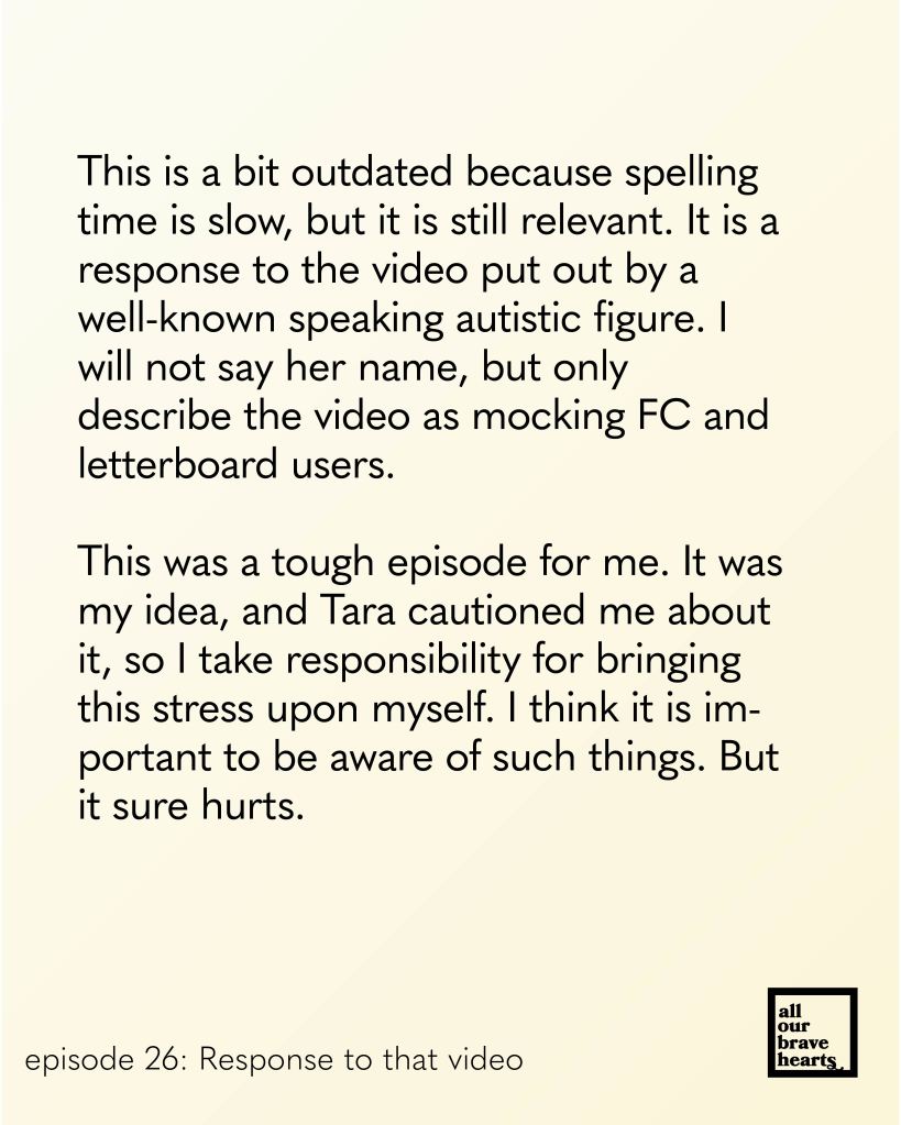 I am glad to share that we have a new All Our Brave Hearts up. It is a bit outdated because spelling time is slow, but still relevant. It is a response to the video put out by a well-known speaking autistic figure. I will not say her name, but only describe the video as mocking FC and letterboard users.