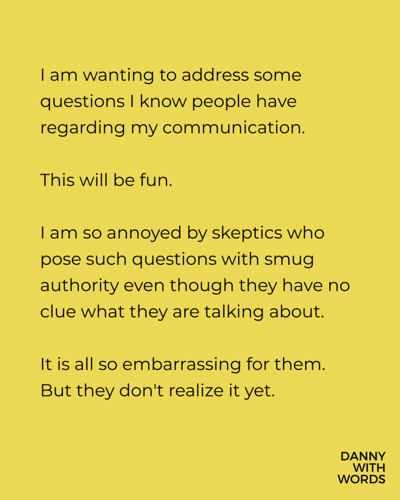 I am wanting to address some questions I know people have regarding my communication. This will be fun. I am so annoyed by skeptics who pose such questions with smug authority even though they have no clue what they are talking about. It is all so embarrassing for them. But they don’t realize it yet.