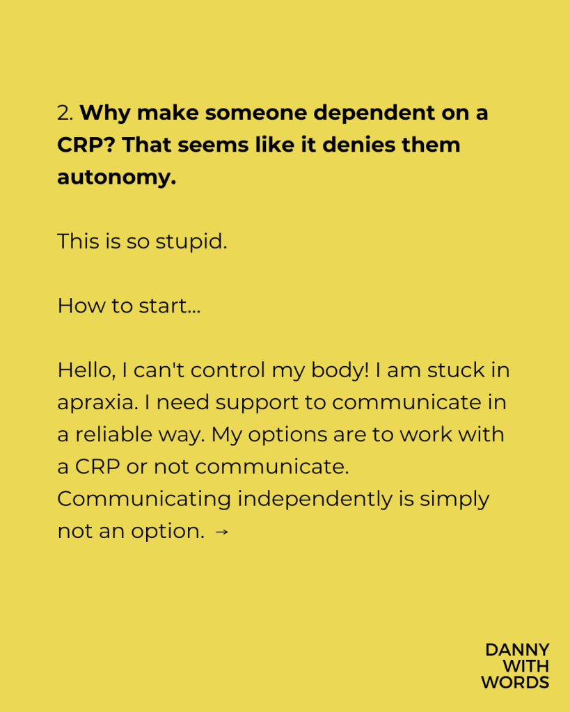 How to start… Hello, I can’t control my body! I am stuck in apraxia. I need support to communicate in a reliable way. My options are to work with a CRP or not communicate. Communicating independently is simply not an option.