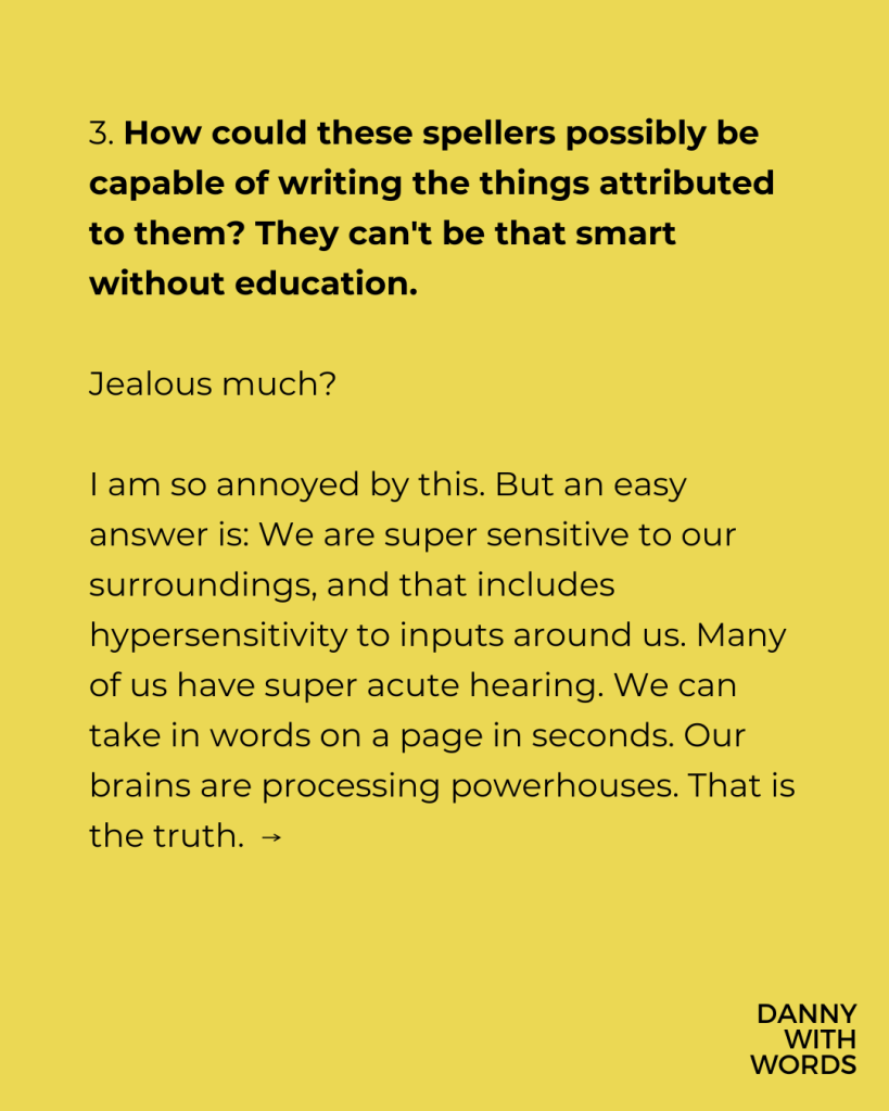 I am a sponge. So despite being denied an education in school, I learned from observing the world. And my parents educated me. Reading advanced books, teaching me up to calculus even before knowing about spelling, playing word games, watching documentaries and the news. That all helped shape my knowledge base. But the main thing is that my brain is just advanced. I am smarter than most people. Most spellers are. You don’t need to get upset about being less smart, because I would personally take somewhat lower intelligence if I could better control my body.