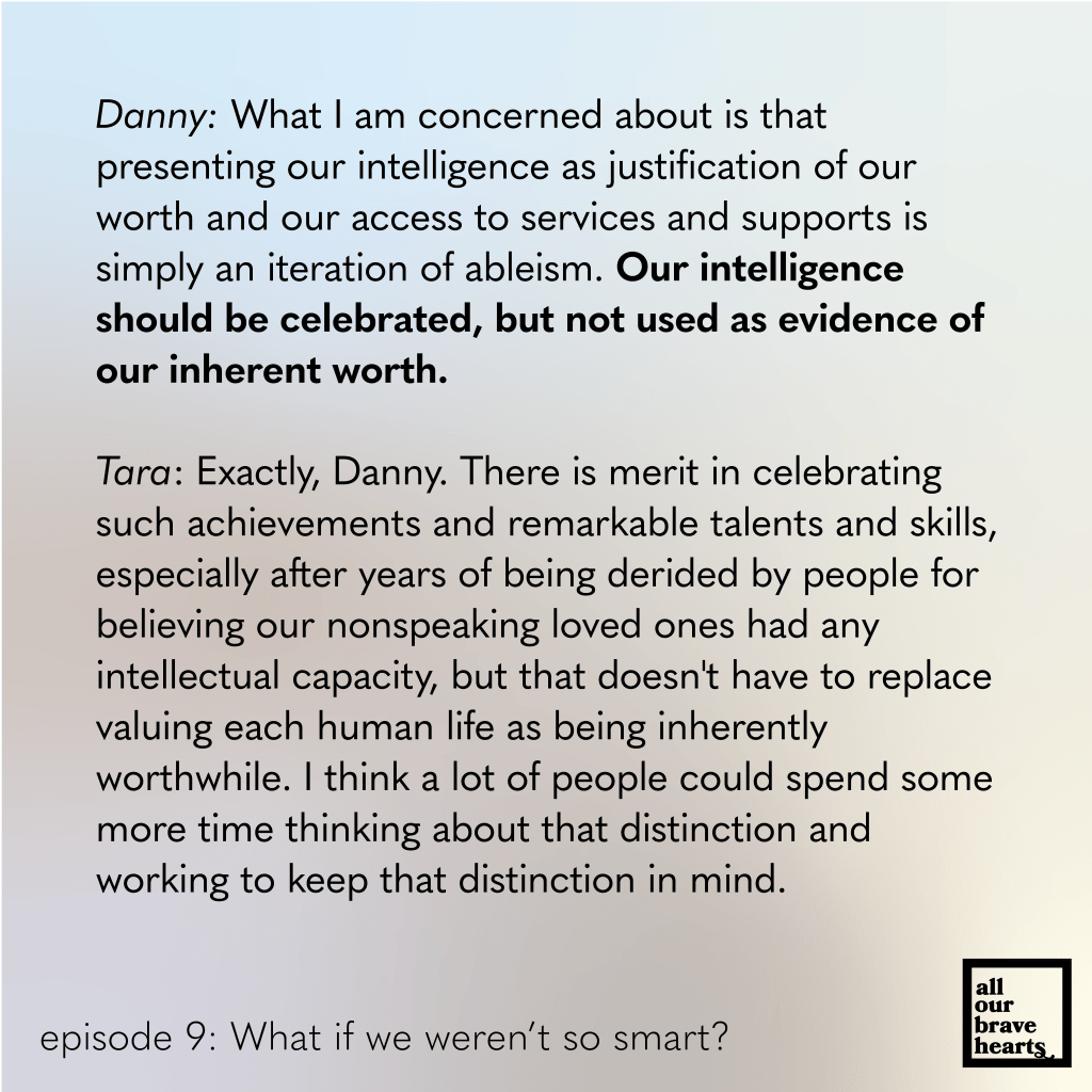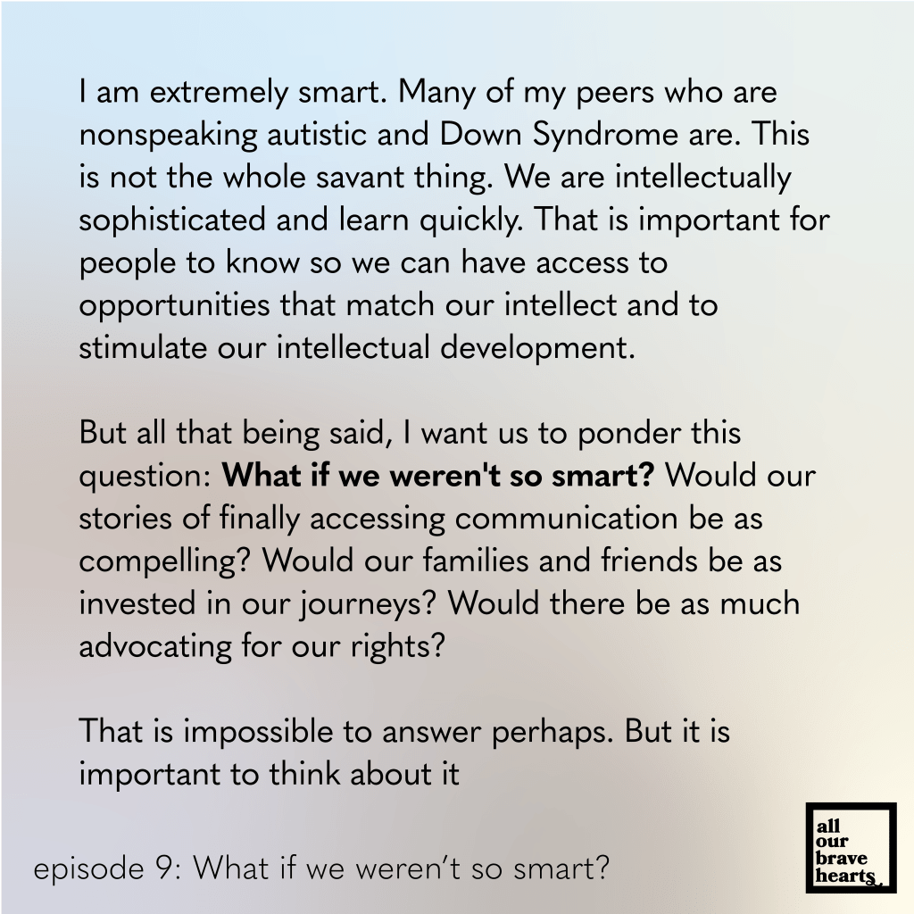 Another episode of All Our Brave Hearts is up! We discuss an idea related to the previous episode on worth: What if I and other spellers were not so intelligent? It is not bragging to say that many of us are incredibly smart. That is just a fact. Many of us are achieving great things and that should be celebrated. We are defying the ignorant assumptions of society and especially close-minded special education teachers. That is important to recognize.