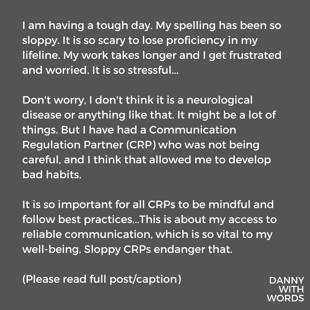 Don’t worry, I don’t think it is a neurological disease or anything like that. It might be a lot of things. But I have had a CRP who was not being careful, and I think that allowed me to develop bad habits. I should have told Tara sooner. But I was not wanting to lose a CRP, even if they weren’t supporting my communication well.